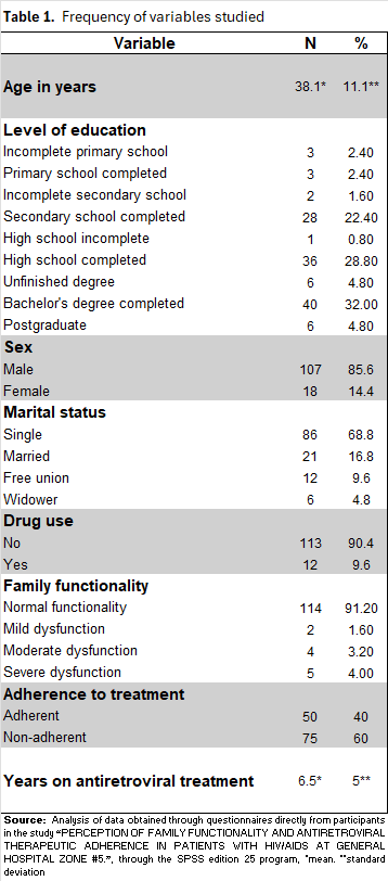 The variable "Family Functionality" was categorized as: "Normal Functionality," "Mild Dysfunction," "Moderate Dysfunction," and "Severe Dysfunction." The frequencies obtained were "Normal Functionality" with 114 cases (91.2%), "Mild Dysfunction" with 2 cases (1.6%), "Moderate Dysfunction" with 4 cases (3.2%), and "Severe Dysfunction" with 5 cases (4%). The frequencies obtained are presented in Table 5. The frequency of the dependent variable "Treatment Adherence" was 40% (50). The average duration of antiretroviral treatment was 6.5 years. Table 1