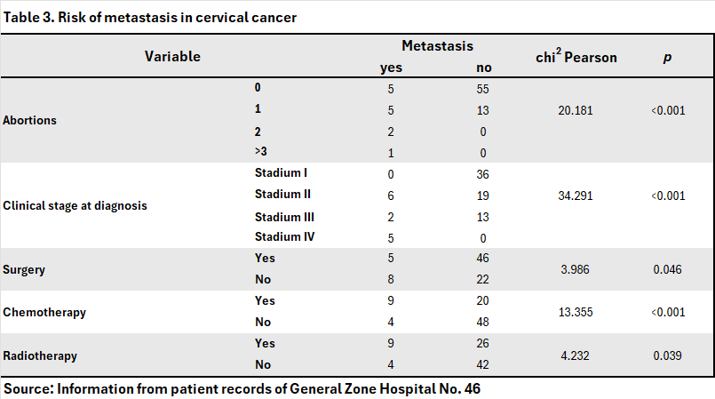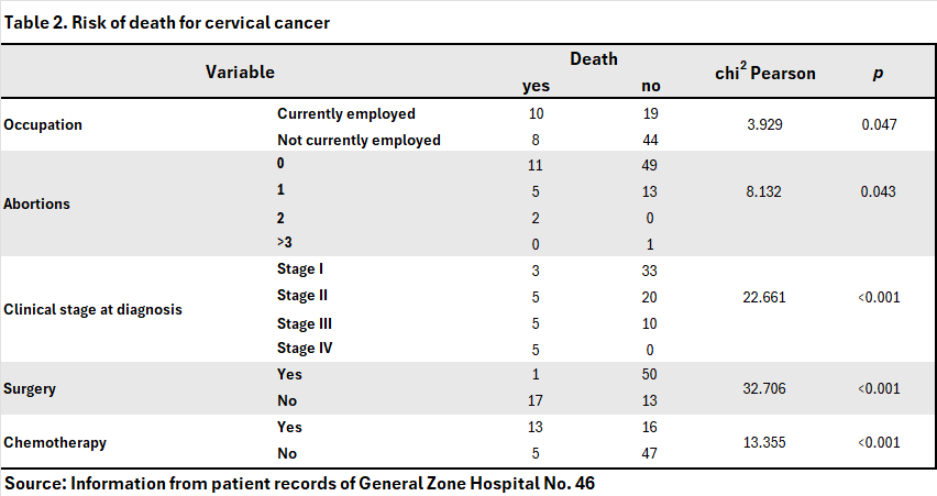 Finally, these findings reinforce the need for public health strategies focused on early detection, equitable access to comprehensive treatments, and close follow-up of patients with cervical cancer, particularly in areas with limited infrastructure. Identifying these factors not only contributes to understanding the clinical behavior of the disease but also lays the groundwork for interventions aimed at improving the survival and quality of life of affected women.