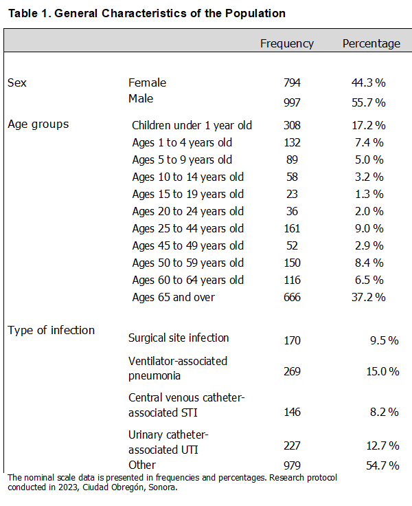 Table 1 presents the general characteristics of the population. Regarding the distribution of cases by sex, males predominated, representing 55.67% (997) of the observations, while females represented 44.33% (794) of the cases. Frequencies were obtained by age group, showing that the largest group was those 65 years and older, comprising 37.2% (666), followed by those under 1 year old, comprising 17.2% (308). The 25-44 age group represents 9.0% (161), followed by the 50-59 age group with 8.4% (150) and the 1-4 age group with 7.4% (132). Next are the 60-64 age group with 6.5% (116) and the 5-9 age group with 5% (89). Less frequently represented are the 10-14 age group with 3.2% (58), the 45-49 age group with 2.9% (52), the 20-24 age group with 2.0% (36), and the 15-19 age group with 1.3% (23). The frequency of healthcare-associated infections studied is also described, with the most frequent being "Other" at 54.7% (979 cases), followed by ventilator-associated pneumonia (VAP) at 15.0% (269 cases), urinary tract infection (CAUTI) at 12.6%, surgical site infection (SSI) at 9.5% (170 cases), and central venous catheter-related infection ( CLABSI) at 8.1% (146 cases).
