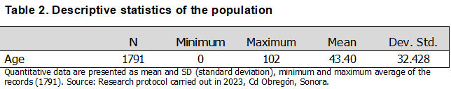 Regarding the age of the participants, Table 2 describes the age range, from 0 years to 102 years, with a mean of 43.40 years and a standard deviation of ±32.428 (SD).