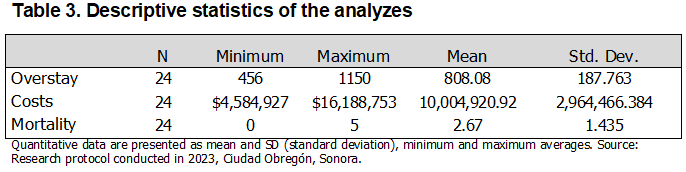 The objective of the study was to understand the impact of HAIs on hospital costs, length of stay and mortality at Regional General Hospital No. 1 Ciudad Obregón, Sonora.