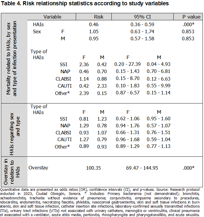 For inferential statistics, normality tests were performed. The risk of mortality with healthcare-associated infections (HAIs), sex, and type of infection was analyzed, as well as the risk of HAIs in relation to type of infection by sex and overstay in relation to the number of HAIs. Associations for qualitative variables were assessed using the Chi-square test (2); for quantitative variables, Student's t-test or Mann-Whitney U test was used, as appropriate.