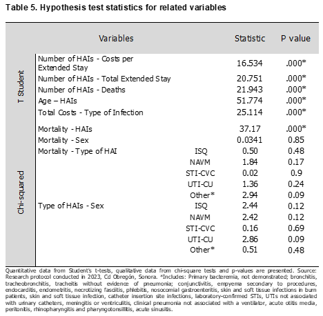 In the development of the hypothesis tests, a student's t-test was performed where statistical significance was found in related variables. On the other hand, a statistically significant chi-square test (2) was found for mortality and HAIs (0.000*), which contrasts with the calculated odds ratio (OR = 0.46), which is also statistically significant, indicating no association between mortality and HAIs. The remaining associated variables did not show statistical significance in this study.