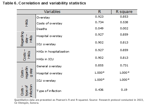 The correlation and variability are determined in Table 6, where the variables number of HAIs and overstay have a Pearson R of 0.923 and R2 of 0.853; the number of HAIs and costs due to overstay R 0.734 and R2 0.538; the number of HAIs and deaths R 0.049 and R2 0.002; overstay due to HAI in hospitalization R 0.927 and R2 0.859 and in overstay in ICU with R 0.902 and R square 0.813. Regarding the costs due to HAIs according to the area, for hospitalization an R 0.927 and for ICU an R 0.902 and R2 0.813. Regarding the relationship between costs and the excess stay generated, an R of 1.000 and an R2 of 1.000 were found for hospitalization, an R of 1.000 and an R square of 1.000 for ICU, while for general excess stay an R of 0.855 and an R square of 0.731. Finally, the relationship between costs and types of infection presented an R of 0.436 and an R2 of 0.190.