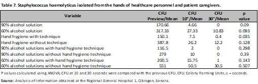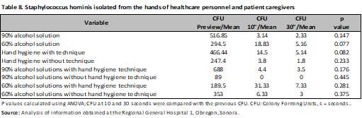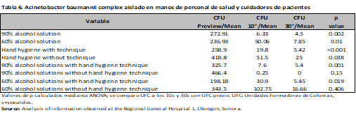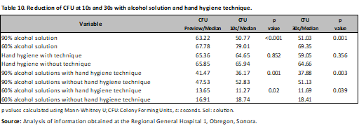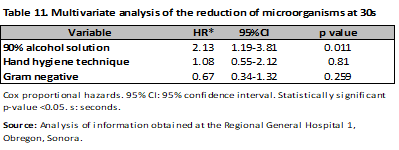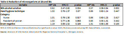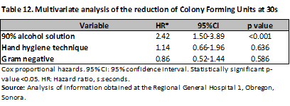 The risk was evaluated through Hazard Ratio (HR), observing that the application of 90% alcohol solution represents a protective factor for the development of microorganisms at 10s (HR 0.62; 95% CI, 0.47-0.82; p<0.001), with no difference with the hand hygiene technique. (HR 1.02; 95% CI, 0.76-1.37; p=0.87) a comparison was made between nurses and resident physicians, without showing differences between them (HR 1.01; 95% CI, 0.78-1.30; p=0.92) and (HR 1.02; 95% CI, 0.77-1.36; p=0.86), finally Gram-negative microorganisms were evaluated (HR 1.19; 95% CI, 0.93-1.52; p=0.18) (Table 4). The same was done at 30s, and again, the protective factor was found to be 90% alcohol solution (HR 0.57; 95% CI, 0.39-0.84; p < 0.001), hand hygiene technique (HR 0.86; 95% CI, 0.60-1.24; p = 0.44), category (nurses and medical residents) (HR 0.86; 95% CI, 0.60-1.23; p = 0.41) and (HR 0.85; 95% CI, 0.55-1.31; p = 0.44). There was no difference in Gram-negative bacteria (HR 1.31; 95% CI, 0.93-1.83; p = 0.13) (Table 4). In the analysis by microorganisms a difference was observed with alcoholic solution and hand hygiene technique mainly, as in the case of Acinetobacter baumannii complex with 90% and 60% alcoholic solution (previous CFU/mean 272.91; CFU 10s/mean 6.33; CFU 30s/mean 4.5; p<0.001), (previous CFU/mean 236.93; CFU 10s/mean 50.06 CFU 30s/mean 7.85; p=0.01) with and without hand hygiene technique (previous CFU/mean 258.90; CFU 10s/mean 19.8; CFU 30s/mean 5.42; p<0.001), (previous CFU/mean 418.8; CFU 10s/mean 51.5 CFU 30s/mean 25; p=0.03), having a similar behavior in the case of Gram positives (Tables 5-9).