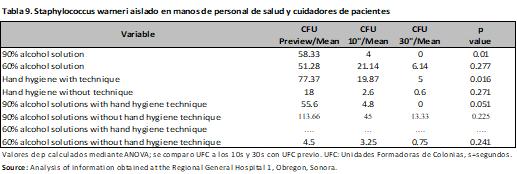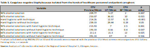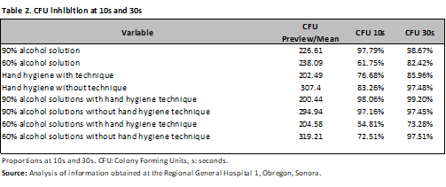 Worldwide, it is estimated that more than 1.4 million people contract hospital-acquired infections; between 5% and 10% of patients admitted to hospitals in developed countries will contract one or more infections. In the United States of America (USA), one in every 136 hospitalized patients becomes seriously ill from a hospital-acquired infection, equivalent to 2 million cases and approximately 80,000 deaths annually.2 This generates an average cost ranging from $382.00 to $1,833.00 US per case; In Canada, the annual cost of nosocomial infections is $0.3 to $1 billion; in Germany, the annual cost is estimated at $0.3 to $0.6 billion. HAIs are the leading cause of prolonged hospital stays, as well as long-term disability, increased deaths, and increased costs.4 Several studies have shown that poor hand hygiene is the most common cause of HAIs.5, 6 Similarly, it has been observed that handwashing with alcohol-based solutions prevents the transmission of nosocomial pathogens by healthcare workers, as alcohols possess antimicrobial activity attributed to their ability to denature proteins.7, 8 Alcohol-based solutions, at concentrations of 60% to 95%, are more effective, while higher concentrations are less potent, as proteins do not denature easily in the absence of water. They also reduce hand hygiene time. They have been shown to have excellent in vitro germicidal activity against gram-positive and gram-negative bacteria, including multidrug-resistant pathogens, Mycobacterium tuberculosis, and several fungi. Some enveloped viruses, such as the Human Immunodeficiency Virus, Herpesvirus, Influenza, and Respiratory Syncytial Virus, are sensitive to alcohol. 7, 8 It is therefore important to practice proper hand hygiene to reduce healthcare-associated infections. Various guidelines recommend that handwashing be performed with alcohol-based solutions at a concentration of 60% for a period of 30 seconds to be effective. The World Health Organization even establishes guidelines for preparing alcohol-based solutions, thus ensuring greater effectiveness. 9, 10, 11 It is worth noting the rise in the use of alcohol-based solutions in recent years, as mentioned by Angeles et al. (2005) in their clinical trial conducted at the IMSS La Raza Medical Center (CMN la Raza), where they compared the effectiveness of using alcohol gel and the traditional hand disinfection technique in reducing CFUs on the hands of doctors and nurses, obtaining a CFU-Log10 reduction of 0.7 versus 1.53 (p≤0.01); observing that the nurses group had a greater reduction in CFUs-Log10 than the doctors (p<0.05). In 2004, at the Department of Medicine of the State University of Maringá, Brazil, Hernandes et al. compared the effectiveness of alcohol-based hand gel with traditional handwashing for the elimination of agents such as Acinetobacter baumannii, methylcylin-resistant Staphylococcus aureus, Escherichia coli, Enterococcus faecalis, Pseudomonas aeruginosa, and Candida albicans. They concluded that handwashing with liquid soap reduced the number of microorganisms by 93.83%, 100% povidone-iodine, and 99% alcohol-based hand gel. They also demonstrated that 4 of 6 microorganisms analyzed with the different disinfectants were removed. 13 On the other hand, Alvarado et al. (2008) studied the antiseptic capacity of two different brands of alcohol-based hand gel, without specifying the final alcohol concentration, and compared its effectiveness with a 70% liquid alcohol solution. They found that the greatest antimicrobial effects for both gels were obtained after 30 s and for liquid alcohol after 1 minute. An ANOVA distribution was used for statistical analysis and it was concluded that the alcohol presentation does not interfere with the percentages of bacterial reduction and the time for maximum bacterial inhibition is 30 s. 14 Kampf and Hollingsworth (2008) evaluated the bactericidal activity of an ethanol-based hand gel in 15 s and its efficacy against 11 gram-positive bacteria, 16 gram-negative bacteria, and 11 emerging bacterial pathogens. Each strain was evaluated in quadruplicate; They found that hand gel (85% ethanol) reduced 11 gram-positive and 16 gram-negative bacteria by more than 5 logs in 15 seconds and that it has a broad bactericidal spectrum. 15 Herruzo-Cabrera et al. (2001) studied the effects of various alcohol solutions on the resident and acquired microbiota, comparing them with conventional handwashing in vivo and in vitro. Significant differences were found in both designs. Handwashing barely modified the native or acquired microbiota (only 0.1 to <2 logs) and did not eliminate Staphylococcus aureus and gram-negative bacteria (34–23%; P > 0.05). However, N-duopropenide reduced the acquired microbiota by 5 logs and the native microbiota by more than 2 logs, as well as S. aureus and gram-negative bacteria (33–1.3%; P < 0.01).The study was conducted at Regional General Hospital No. 1, located in Ciudad Obregón, Sonora. The study period ran from March 1 to July 31, 2015. A quasi-experimental, double-blind study was conducted with healthcare personnel and family members of patients who met the inclusion criteria.