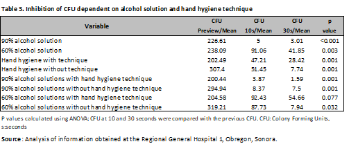 Colony-forming unit inhibition was evaluated using analysis of variance (ANOVA), which compared the inhibition with 90% alcohol solution, obtaining a p < 0.001, with a mean of 226.61 CFU in the pre-culture, with development of 5 CFU at 10 s and 3.01 CFU at 30 s after application of the alcohol solution. When applied with 60% alcohol solution, a p = 0.03 was obtained, with a mean of 238.09 CFU in the pre-culture, 91.6 CFU at 10 s, and 41.85 CFU at 30 s (Table 3).