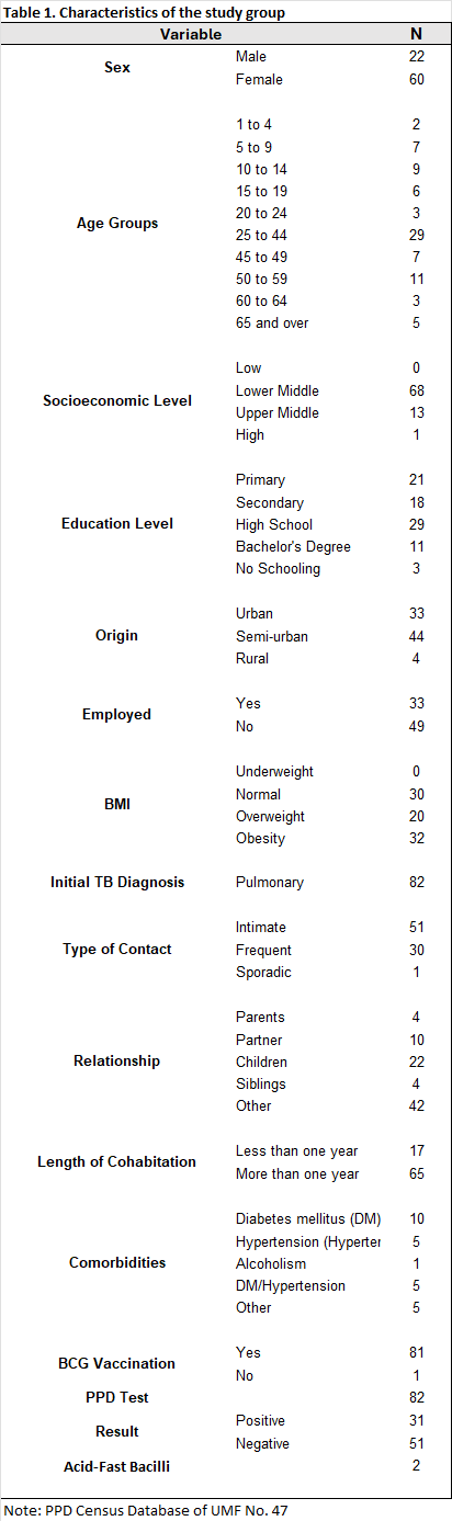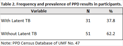 The study was conducted at Family Medicine Unit No. 47, IMSS Tabasco, as an analytical cross-sectional observational study from June 1 to December 31, 2024. The study population consisted of 164 contacts of patients with active pulmonary tuberculosis, registered at UMF No. 47. The sample size was calculated in EpiDat using the formula for estimating a proportion in a finite population, considering a 95% confidence level, a 5% margin of error, and an expected proportion based on previous studies (47%), resulting in an estimated total of 115 participants. Contacts of patients with active pulmonary tuberculosis were included, regardless of age or sex, provided they underwent PPD testing. Individuals without contact with patients with active pulmonary tuberculosis and those who did not undergo PPD testing were excluded.