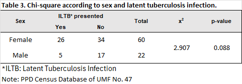 In the bivariate analysis comparing sex and PPD result, a higher proportion of latent tuberculosis infection (LTBI) was observed in women (83.9%) compared to men (16.1%). The chi-square test showed no difference when comparing these two variables (χ² = 2.907; p = 0.888), This indicates that, in the studied population, the risk of developing ILTB is independent of sex. indicating that latent tuberculosis infection does not show a sex predilection (Table 3).