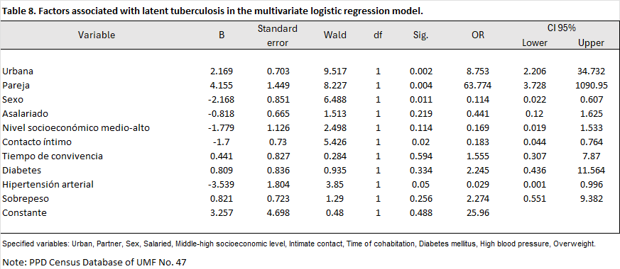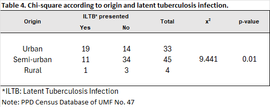 Regarding the origin of the contacts, the risk was 4.185 (95% CI: 1.620-10.809), meaning that those living in urban areas have a four times greater risk of latent tuberculosis infection compared to those living in semi-urban and rural areas.