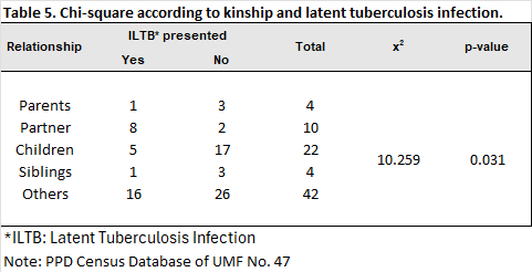 A comparison of latent tuberculosis diagnosis and place of origin revealed a statistically significant difference (χ² = 9.441; p = 0.01). These results suggest that geographic origin significantly influences the occurrence of the event (Table 4). In the group with the kinship variable, the comparison between kinship and the diagnosis of latent tuberculosis infection (LTBI) was statistically significant (χ²=8.624; p=0.031). This indicates that having any type of kinship with a patient with active tuberculosis is a factor for having latent tuberculosis infection (Table 5).