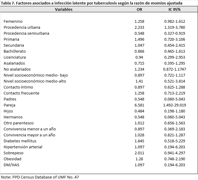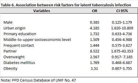 Among comorbidities, contacts who were overweight had a risk of 2.567 (95% CI: 0.917–7.185) cruza el 1, meaning that those with this comorbidity have twice the risk of having latent tuberculosis infection (LTBI).