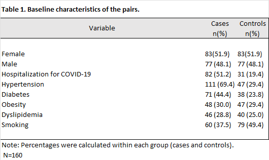 Furthermore, it was confirmed that each pair contained a single case with a confirmed diagnosis of cerebrovascular disease (CVD = 1) and a single control without such a diagnosis (CVD = 0). This preliminary review ensured compliance with the matched design and allowed for bivariate and multivariate analyses conditioned on the matching. Initially, 167 pairs (334 participants) were identified; however, 7 pairs were excluded after applying the exclusion criteria and confirming that they had the necessary information, resulting in a final sample of 160 pairs (320 participants). The characteristics of the study population are described below. The 320 participants comprised 160 pairs with a 1:1 matching ratio, with 160 patients who had experienced a stroke and 160 who had not. The average age was similar in both groups, with a mean of 62.9 years and a standard deviation of ±14.6 years, confirming adequate age balance resulting from the matching. Regarding sex, the distribution was equitable between cases and controls, with 51.9% women and 48.1% men in both groups, indicating complete control of this variable in the study design. The age distribution showed a similar composition in cases and controls, with a predominance of participants ≥65 years old (cases: 44.4%; controls: 45.6%). The median age was comparable (cases: 62.5; controls: 63.0), and the interquartile range was close (cases: 17; controls: 19), reinforcing the age comparability achieved through matching. Regarding the exposures and comorbidities analyzed, a history of hospitalization for COVID-19 during the acute phase was considerably more frequent in the case group (51.2%) compared to the control group (19.4%). Similarly, the prevalence of hypertension (69.4% in cases vs. 29.4% in controls) and diabetes mellitus (44.4% in cases vs. 23.8% in controls) was higher in the case group. In contrast, the proportions of obesity (30.0% vs. 29.4%) were higher in the control group. The prevalence of diabetes (29.4%) and dyslipidemia (28.8% vs. 25.0%) was similar between both groups. Finally, smoking was more frequent in controls (49.4%) than in the cases (37.5%). Table 1.