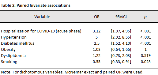 The comparison of the history of hospitalization for Covid-19 and the development of stroke was analyzed using McNemar's test. Bivariate analysis was performed respecting the paired structure for the study type. For age, the paired Wilcoxon test was applied, yielding results without evidence of a statistically significant difference between cases and controls (p = .264). For dichotomous variables, the exact McNemar test was used, and the paired odds ratio (OR) was estimated based on discordant pairs. A positive association was observed between hospitalization for Covid-19 and stroke (OR = 3.12, 95% CI [1.97, 4.95], p < .001), with 99 discordant pairs, providing a large sample size for this estimation. Similarly, hypertension was the variable with the strongest association with the development of stroke, with an odds ratio (OR) of 5.00 (95% CI: 2.92–8.55; p < .001), supported by 96 discordant pairs, along with diabetes mellitus, which also showed a statistically significant association, with an OR of 2.50 (95% CI: 1.52–4.10; p < .001), based on 77 discordant pairs. In contrast, obesity (OR = 1.03, 95% CI [0.64, 1.66], p = 1.000; 67 discordant pairs) and dyslipidemia (OR = 1.22, 95% CI [0.73, 2.03], p = .519; 60 discordant pairs) did not show a statistically significant association. On the other hand, smoking showed an inverse association (OR = 0.55, 95% CI [0.33, 0.91], p = .025; 65 discordant pairs). Furthermore, the effective information for each exposure was corroborated using the number of discordant pairs, as described by their "information ratio" (discordant/pairs). This ratio varied by exposure, being highest for a history of hospitalization (0.62) and hypertension (0.60), thus contextualizing the relative precision of the estimates for each variable. Table 2.
