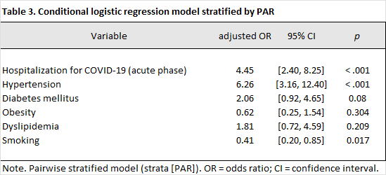 An important point to highlight is the history of smoking, as it showed an apparent protective effect (aOR 0.41). This finding should not be interpreted as a genuine biological effect, but rather as a manifestation of methodological bias, specifically survival bias. It is plausible that smokers with severe SARS-CoV-2 infection experienced higher mortality during the acute phase, which led to their exclusion from the follow-up cohort for cerebrovascular risk assessment. Consequently, the analyzed population would be predominantly composed of subjects with a lower cumulative smoking burden or with physiological characteristics that confer greater resilience, generating a systematic distortion in the estimate and underscoring the need to interpret this result within a framework of bias control and sensitivity analysis.